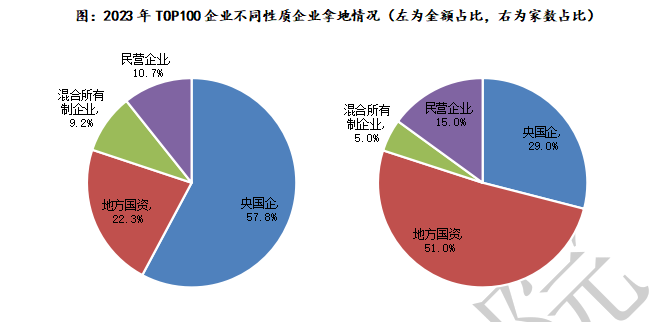 数据显示,2023年,TOP100企业中民营企业数量增加至15家,但拿地金额占比仅为10.7%。
