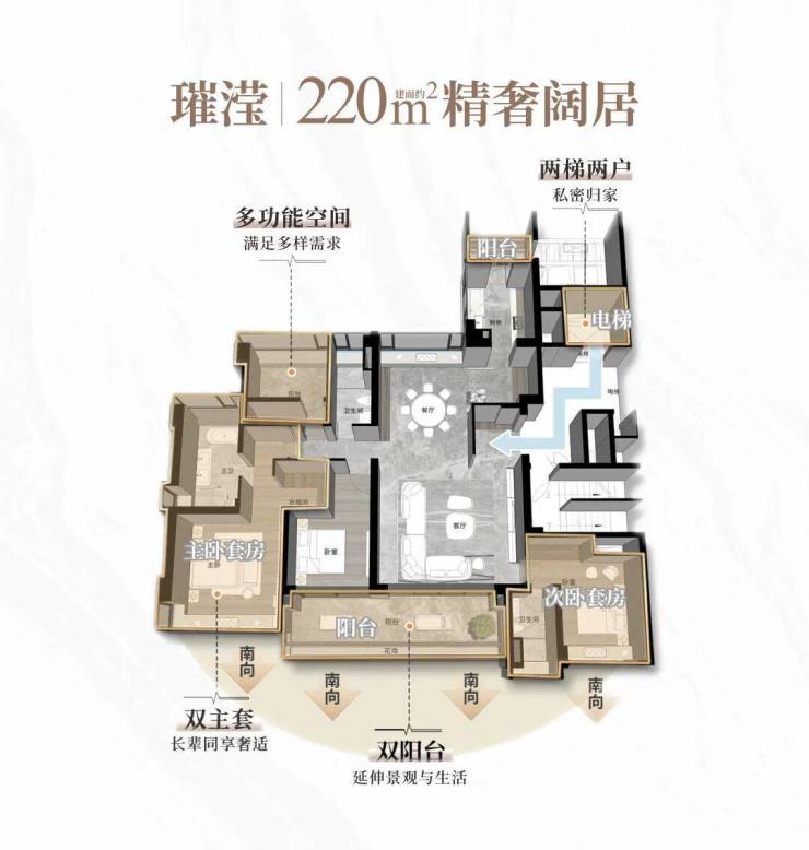 310平方米五房则展现了高端住宅的空间艺术。该户型拥有10米长的跑道式阳台,双主套设计满足多代同住需求。约20米的南向大面宽,配合高达38%的窗地比,带来了270°流光巨幕,环幕式滨水绿州、繁华城景直接呈现在面前。