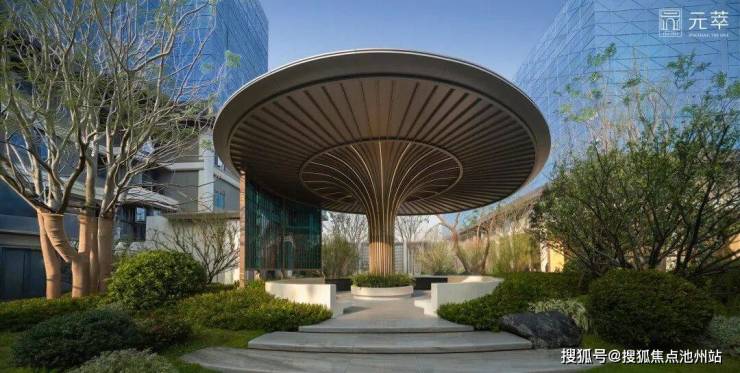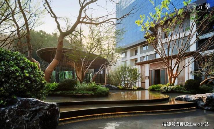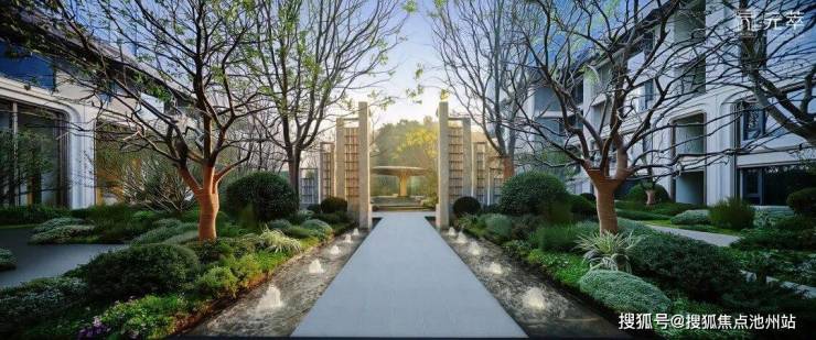 项目打造立体多维水景园林,极具标识性的建筑,层层交错的水景与植被,赋予整片中央园林极强的层次感。以门、台、水、亭四景成轴,借鉴古法匠艺于中央水景,巧设全景会客厅。甄选朴树、乌桕等珍稀名木,引入樱、桂、枫、梅等四季花木,营造立体多维的水景园林。