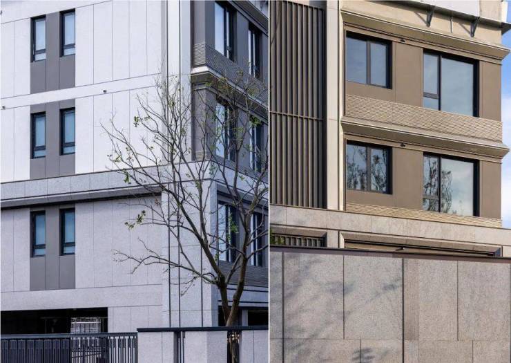 整体外立面以浅色香槟铝板线条、深色香槟铝板窗套搭配暖灰色真石漆,配色更具活力。