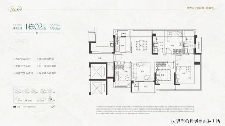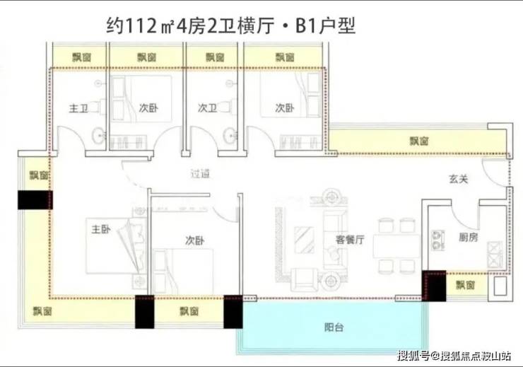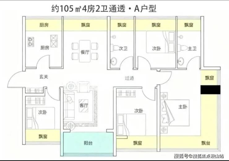 约105-122㎡四房:作为“功能型品质起步”户型,凭借新规下的高实用率(包含赠送得房率约100%)选。主卧均带270°环绕式飘窗,户型设计通过飘窗“送了不少面积