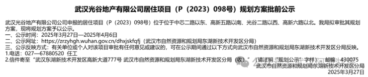 2025年3月27日,武汉光谷地产有限公司居住项目(P(2023)098号)规划方案批前公示,即光谷金融港板块又添一四代住宅。