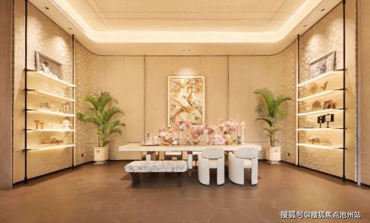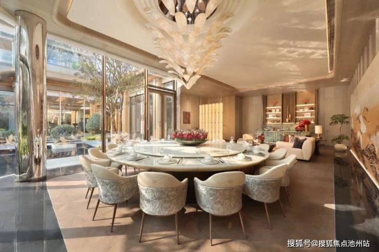 大门门头宽约80米,整体恢弘大气,顶部为藻井星空顶造型,中间是整块汉白玉材质的雕塑,两侧是6扇贝金米黄奢石整包的屏风,背景墙采用铂金钻奢石+铝板+贝金米黄石材...光大门就是一座“奢石博物馆”。