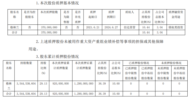 根据公告,绿地控股于2021年6月22日接到排名前列大股东上海格林兰投资企业(有限合伙)(“格林兰”)通知,获悉其所持有公司的部分股份质押给了中国信达资产管理股份有限公司(“信达资管”),具体事项如下: