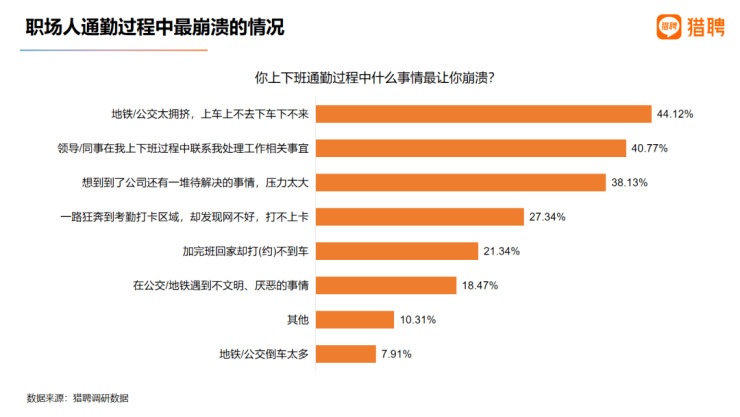 据猎聘统计,上下班通勤过程中,最让打工人崩溃的就是“地铁/公交太拥挤,上车上不去下车下不来”,以44.12%的得票率位居排名前列。