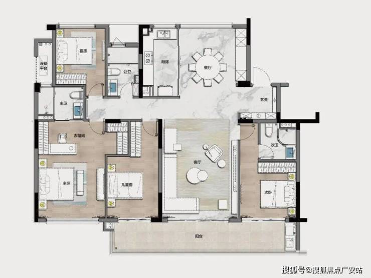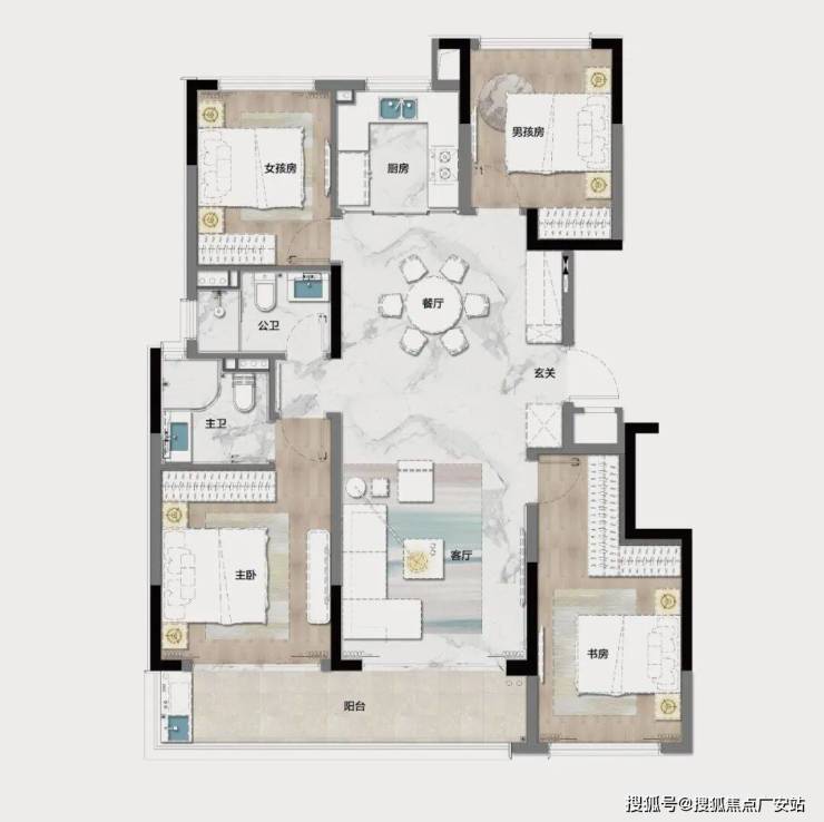 南向三开间,带一个双联阳台;四叶草设计,几乎没有浪费的空间,含赠送的得房率高达85%。这个户型也有着出色的储物空间,除了玄关外,客餐厅还可以打造出一个餐边柜;南向次卧也能拥有大的储物空间。