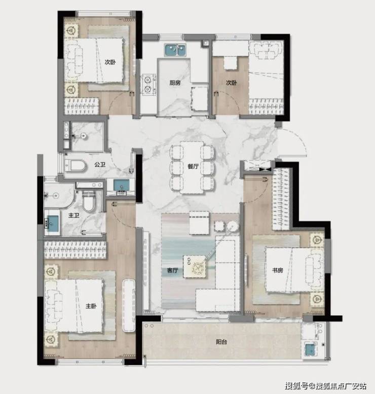而建面约180方户型设计为四房两厅三卫,整个空间尺度非常阔绰。南向四开间,主卧、次卧、客厅、次卧一字排开,南向双套房设计,总面宽达到了约14.8米。尤其值得一提的是,南向光阳台长度就超过了12米;未来喝茶阅读、观景休憩,惬意无边。