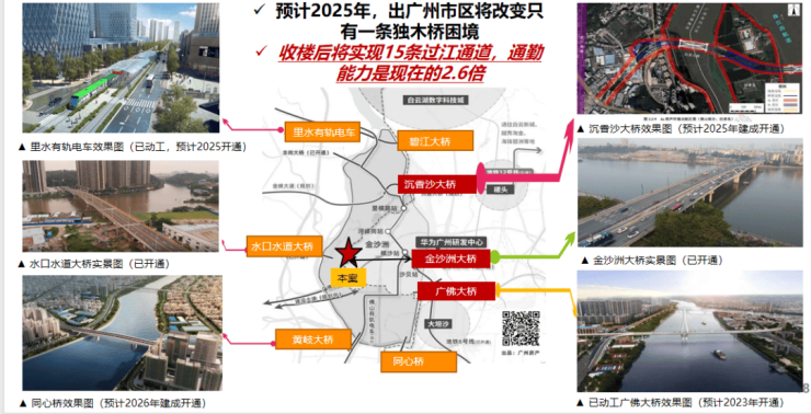 广佛同心桥(金沙洲连接荔湾滘口) :南北连通,从金沙洲南部出岛,接往老荔湾滘口、芳村、海珠西;