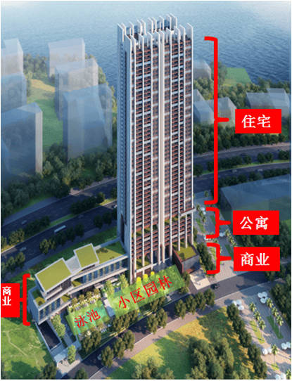 产品方面:项目按照南站的整体规划,总高度160米,由一栋51层高的塔楼和一层5层高的裙楼组成,项目塔楼的一、二层以及裙楼部份为商业,三层和九层是空中花园,四层至八层为公寓,十层至五十一层为住宅,其中二十层和三十六层为避难层,共320户。