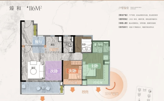 建面116平四房两卫,动区采用LDKB一体化设计,超长的6米大阳台,约14米的南向采光,主卧大L型飘窗,270度采光