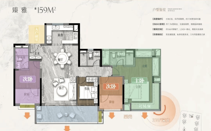 建面159平四房三卫,LDKB客厅,所有房间全部南向,约7.7米景观阳台,南向采光面达到17米,非常通透,视野非常好