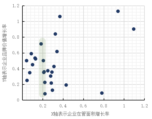 对于物业管理行业而言,高规模并不必然等于高质量发展,也并不必然形成对企业品牌价值的等效正向推动。通过分析2022年品牌企业品牌价值增长率与品牌企业管理面积增长率情况,研究组并未发现二者之间呈现出任何明确关系,由此可见,虽然品牌企业规模增长是推动企业品牌价值增长的重要因素,但是规模增长效率与企业品牌价值增长效率间并不存在理想的强相关关系。这启示物业品牌企业需要更加理性地看待规模扩张对于自身品牌价值增长所产生的效能,特别是那些已经经历了多轮规模扩增的企业,现阶段可能未必要过分迷信外延式发展,因为任何基于“增长焦虑”而大规模开展的收并购行为可能是企业战略层面的较佳选择,但也存在战术层面失效的风险。虽然通过收并购杠杆可以在短时间内实现管理面积的激增,但是若不能在新增项目上提升或保持原有服务品质及品牌影响力,不能达到“1+1>2”的品牌整合效果,那么该企业的品牌价值大概率将不会因为此次并购事件而获得明显增长。