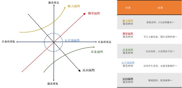 基于对业主需求的深刻洞察,才能明确企业品牌创新发展的方向,强化品牌在市场中的竞争力。根据卡诺模型(KANO模型)[ KANO 模型是对用户需求分类和优先排序的有用工具,以分析用户需求对用户满意的影响为基础,体现了产品性能和用户满意之间的非线性关系。整体可以分为五类:魅力属性:用户意想不到的,如果不提供此需求,用户满意度不会降低,但当提供此需求,用户满意度会有很大提升;期望属性:当提供此需求,用户满意度会提升,当不提供此需求,用户满意度会降低;必备属性:当优化此需求,用户满意度不会提升,当不提供此需求,用户满意度会大幅降低;无差异因素:无论提供或不提供此需求,用户满意度都不会有改变,用户根本不在意;反向属性:用户根本都没有此需求,提供后用户满意度反而会下降。]原理,品牌企业对业主需求进行分类及优先级排序,系统分析服务内容与业主满意度之间的非线性关系,得出结论:企业要强化业主对物业服务品牌的感知,需要保障具有“必备属性”的服务项目供给,例如,社区安防、公区清洁卫生等,同时增加具有“魅力属性”和“期待属性”的服务内容供给,例如星级会所、1V1定制服务、节日主题包装、园区宠物管理等项目,此外,还要严格控制并减少具有“反向属性”的服务内容供给,例如非必要的楼道监控、低效维修等。