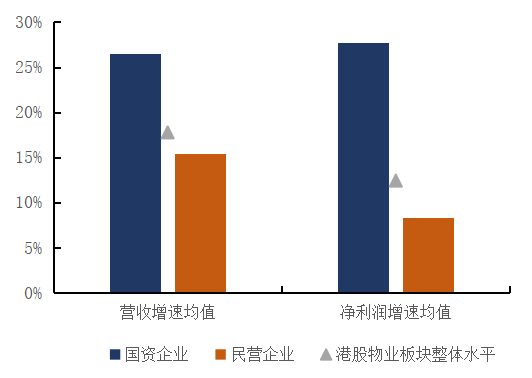 2022年,在行业整体发展速度趋缓的背景下,国资物业服务企业的经营业绩表现突出。上半年,港股物业板块国资企业的营收增速均值约为26.5%,净利润增速均值为27.8%,分别高于港股物业板块整体水平8.8和15.4个百分点,同期港股物业板块民营企业的营收增速均值为15.4%,净利润增速均值为8.3%,分别低于国资企业11.1和19.5个百分点。