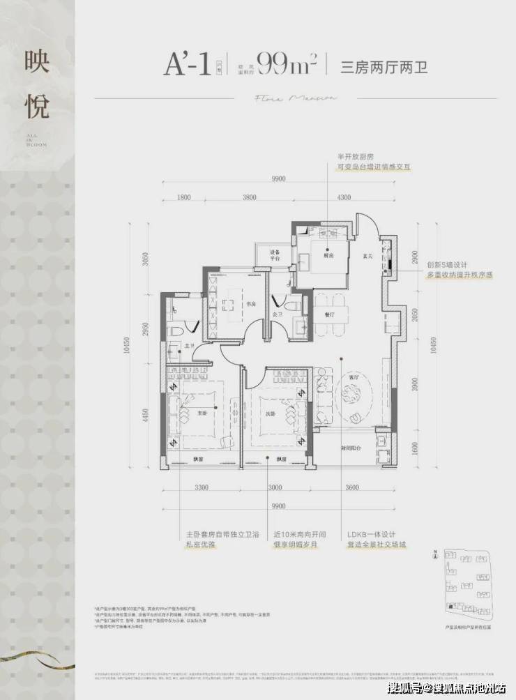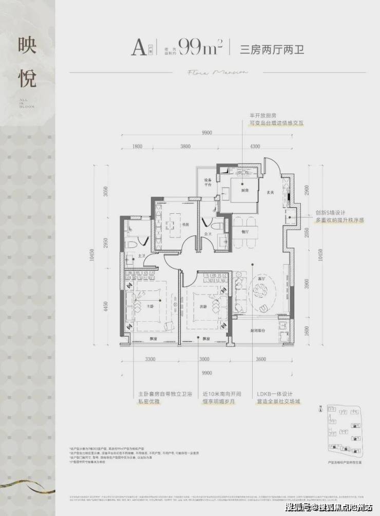 该边套户型,不仅有270度的采光视野,主/次/客卧三大开间并立朝南,“含阳光量”十足。