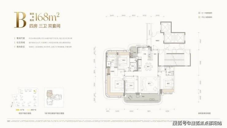 :主推143–332㎡大平层,层高 3.15–3.3 米,得房率近100%。