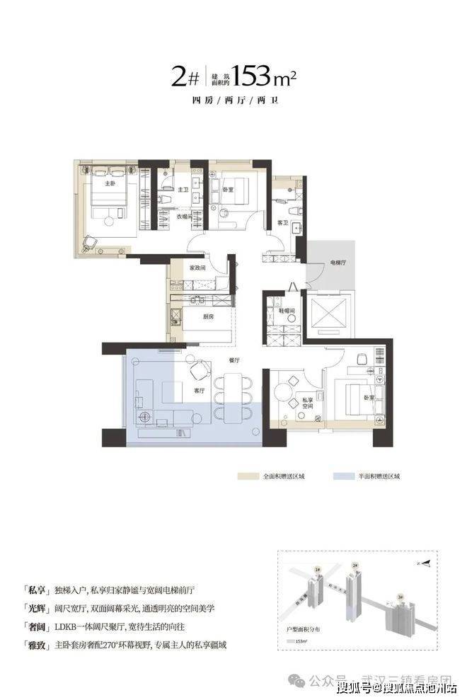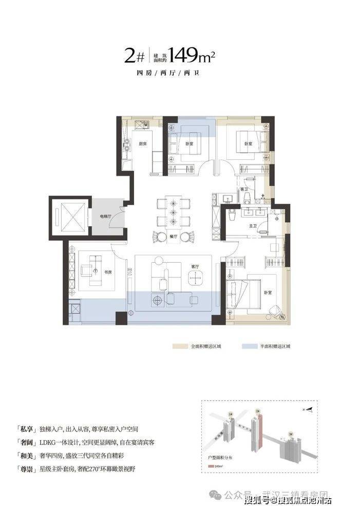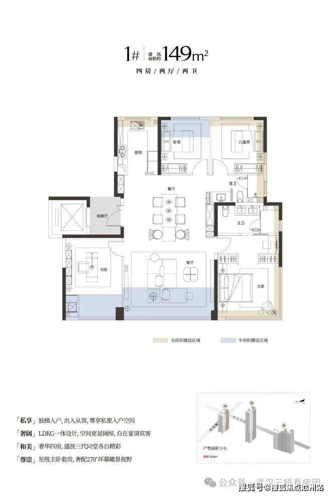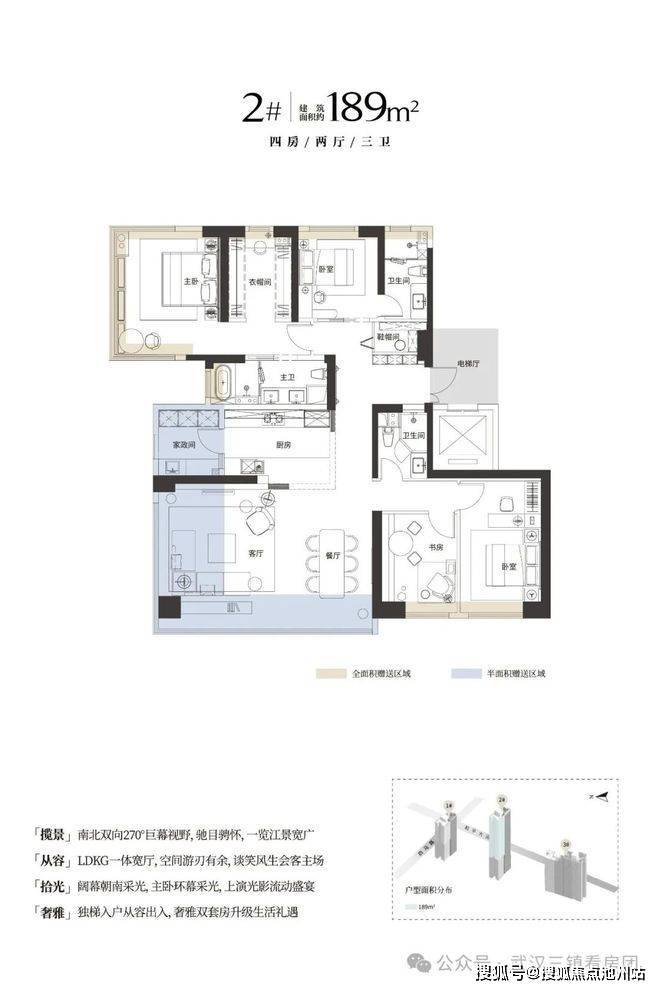 1号、2号楼靠近和平大道一侧为149㎡户型,西侧3-15层为153㎡;16层及以上为189㎡有看江视野;3号楼为146㎡、153㎡和189㎡户型组合。