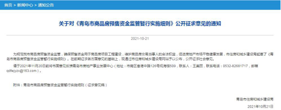 10月21日,青岛市住建局发布关于对《青岛市商品房预售资金监管暂行实施细则》公开征求意见的通知,通知显示,未开立监管账户并签订预售资金监管协议的,不得核发《商品房预售许可证》。