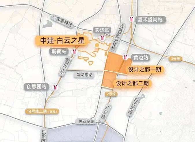距黄边站约800m,3站白云新城,直达江南西,广州南。14号线二期约300米、鹤南(建设中)直线距离约800米,直达火车站。