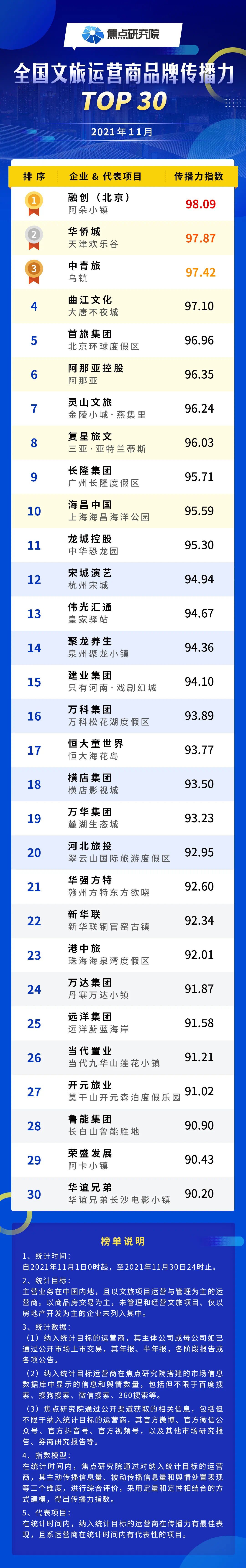 权威发布 | 11月全国文旅运营商品牌传播力TOP30