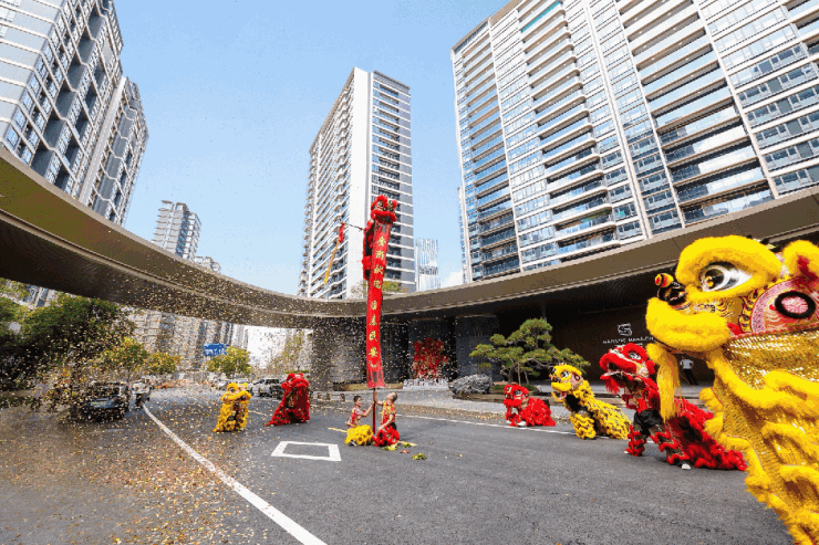 交付现场围绕“归家礼序”多处精心设置的场景,融合温州传统与现代美学。入口处,醒狮点睛仪式寓意“事业顺遂、生活丰裕、好运常伴”,拉开归家序幕;单元大堂设置“繁花迎宾”艺术装置,象征生活美满;入户门处的酒红缎带与“蝴蝶结”饰件,在剪彩瞬间将仪式感推向高潮。