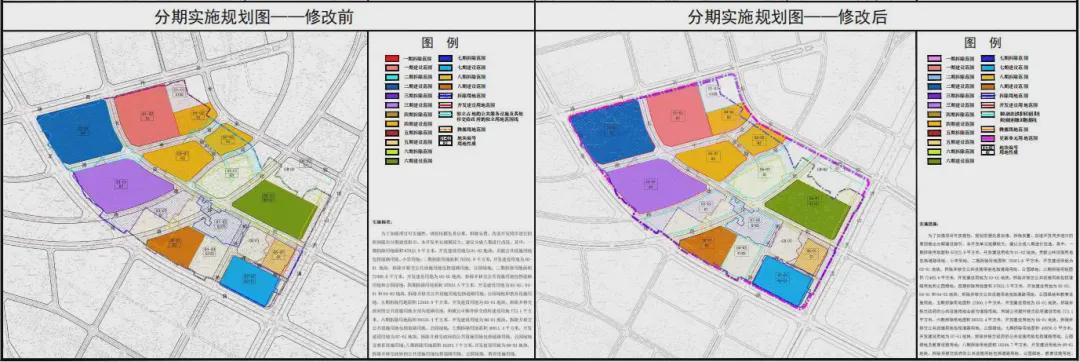 三期03-01地块幼儿园建筑面积由2500平方米调整到3200平方米;八期08-01地块幼儿园建筑面积由5200平方米调整到6000平方米。调整四期各地块人行出入口;微调五期和七期拆除范围。