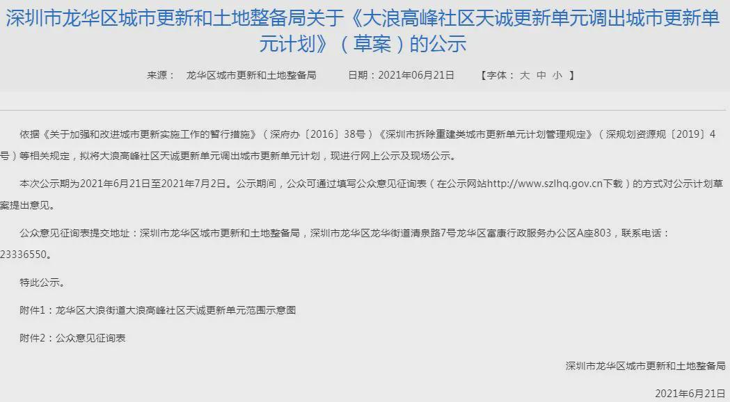 6月21日,龙华区城市更新和土地整备局发布大浪街道大浪高峰社区天诚更新单元调出城市更新单元计划草案公示,拟将该项目调出单元计划。