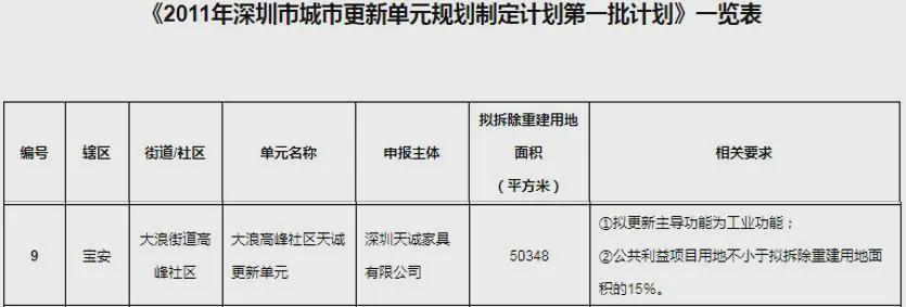 大浪高峰社区天诚更新单元被列入《2011年深圳市城市更新单元规划制定计划排名前列批计划》,拟拆除重建用地面积50348㎡,拟更新主导功能为工业功能,公共利益项目用地不小于拟拆除重建用地面积的15%。