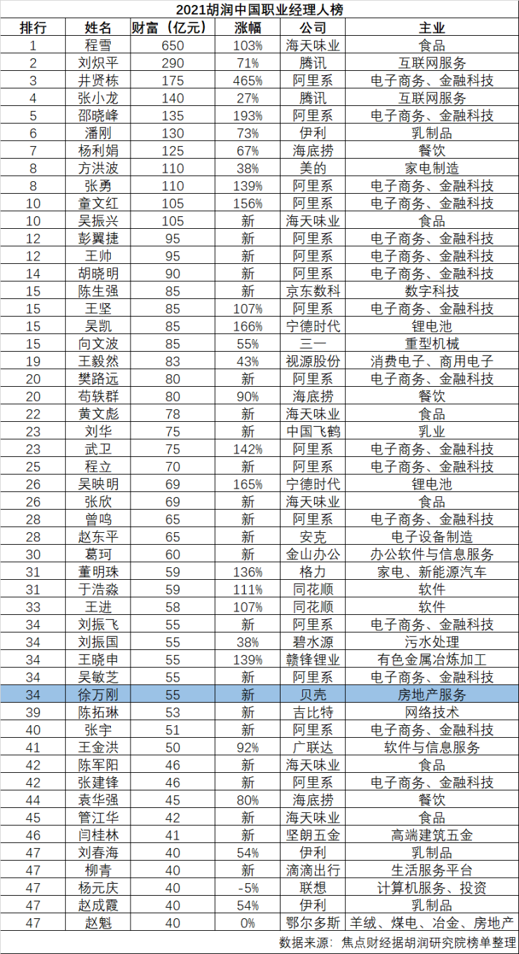 少有一位与地产有些关联的“打工富豪”,是来自房地产服务业的贝壳找房COO徐万刚,他以55亿的身家位列34位。