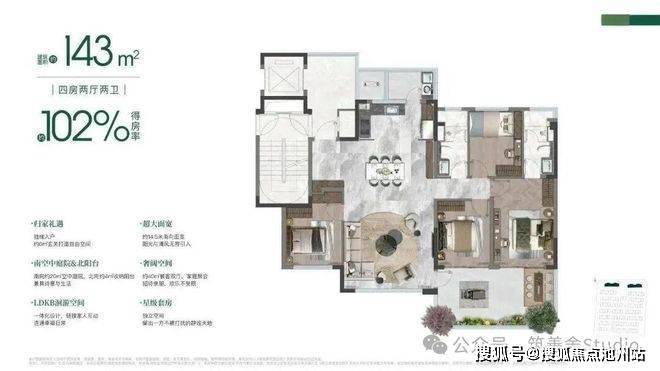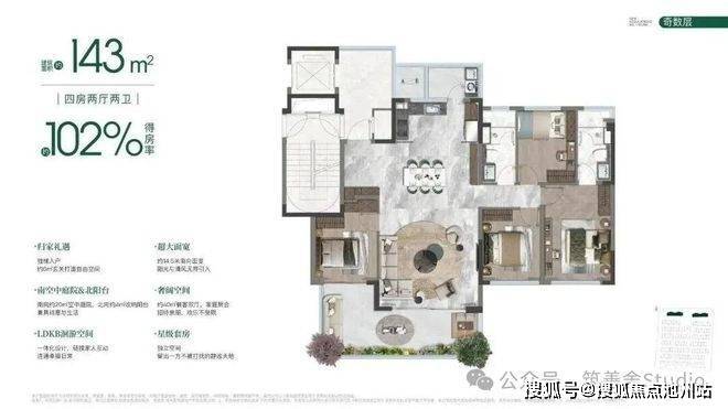 143㎡四代洋房(精装):作为项目的明星户型,它的配置堪称“越级”——约14.5米南向四开间,三室朝南,全明通透,让阳光铺满整个家;约20㎡南向空中庭院+4㎡北向阳台免费赠送,拓展了生活空间的可能性;40㎡餐客双厅采用LDKB洄游设计,通透开阔,适合家庭聚会;独立电梯入户+6㎡玄关,私密性拉满,这样的配置,在同级180㎡+户型中才较为常见。交付方面,日立中央空调、威能地暖、高怡卫浴(或同等品牌)一应俱全,无需额外费心,轻松实现品质居住。