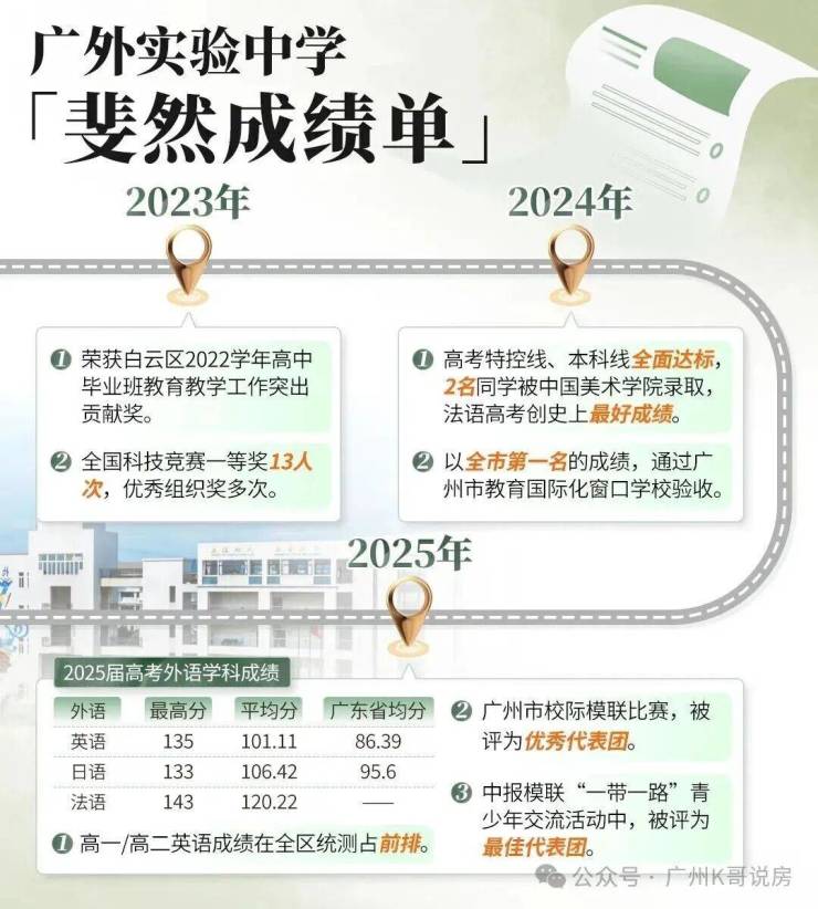 2025年,高一高二英语成绩,在全区统测位居前列,高考同样辉煌,其中英语最高135分、法语最高143分,妥妥广州第一梯队。