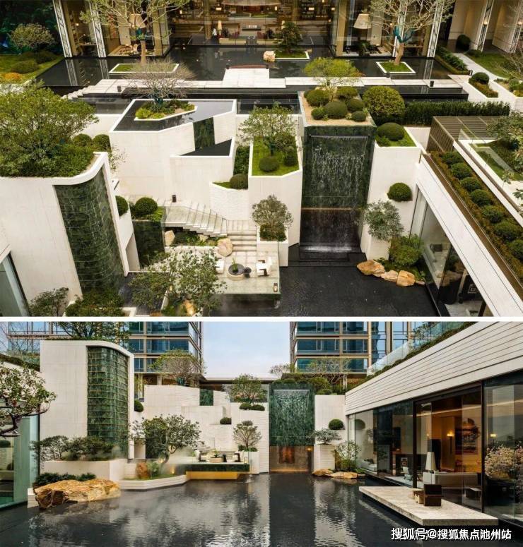 浮岛社区:整体抬高3.8米,首层6米挑高架空,形成“一轴七岛十一境”立体园林,含下沉庭院、镜面水景等;