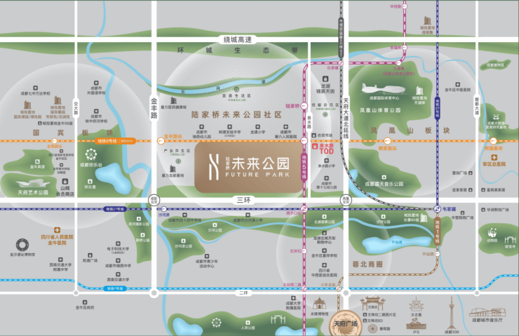 【公园】:三大主城地标级公园环伺、成都艺术名片-【天府艺术公园】、赛事名城-【凤凰山体育公园】、家门口的娱乐圣地-【成都露天音乐公园】