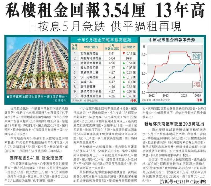 先唠唠租金回报率创新高这事儿。中原城市租金回报率(CRI回报率)5月到了3.54厘,是2012年11月以来的峰值 。啥概念?就是现在买私楼出租,租金收益比以前高多了。像西环嘉辉花园,回报率直接干到5.41厘,全港第一!这说明啥?市场上租金在涨,房东们收租更爽了。以前买楼担心租金不够还月供,现在回报率上去了,收益更稳,投资吸引力蹭蹭涨。