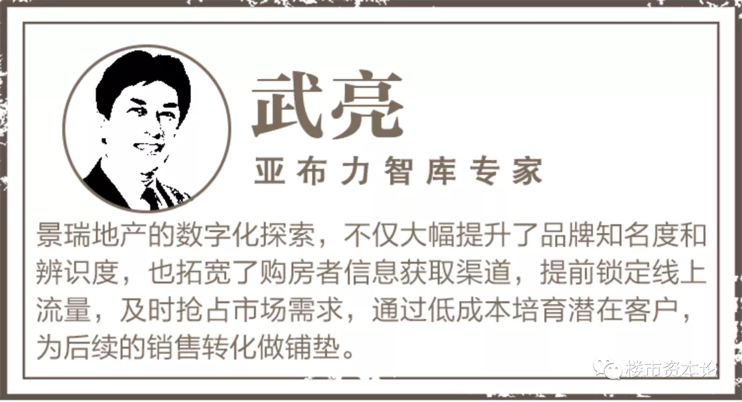 对此,亚布力智库专家武亮表示,景瑞地产的数字化探索,不仅大幅提升了品牌知名度和辨识度,也拓宽了购房者信息获取渠道,提前锁定线上流量,及时抢占市场需求,通过低成本培育潜在客户,为后续的销售转化做铺垫。