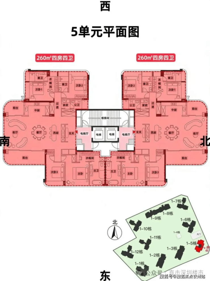 5单元:21层2梯2户、层高3.3m、约260㎡4房4卫(三套房南北双阳台)顶楼约500㎡大平层(带泳池)