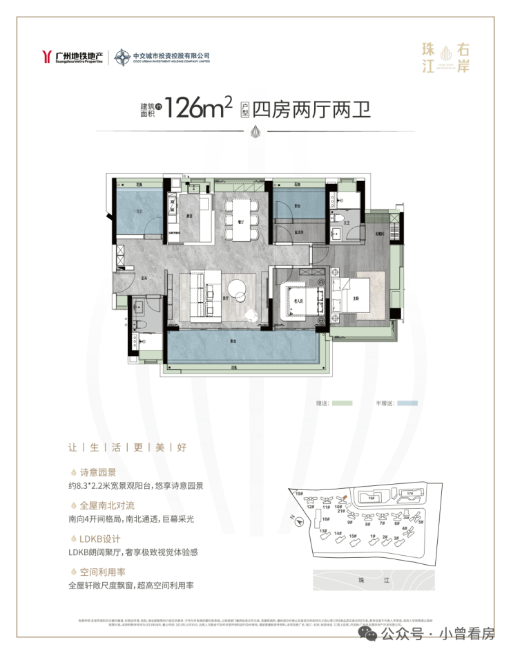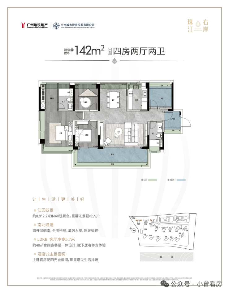 四开间朝南,主卧还采用南北对流设计,观景阳台长达近8米……