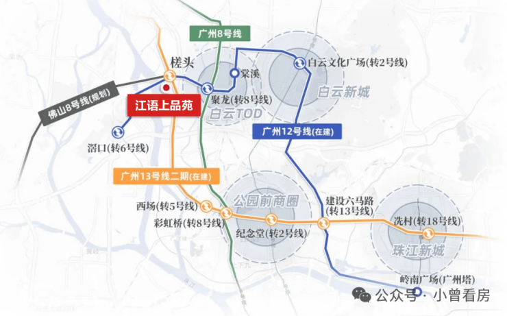 其二,项目于槎头地铁站上盖,广州12号线(2024年通车)、13号线(2024年通车)及佛山8号线(规划中)三轨交汇,无缝直达广州核心区,TOD开发模式激荡着强劲的发展活力,在轨道交通的助力下,一个充满活力的广州西岸“画卷”正徐徐展开。