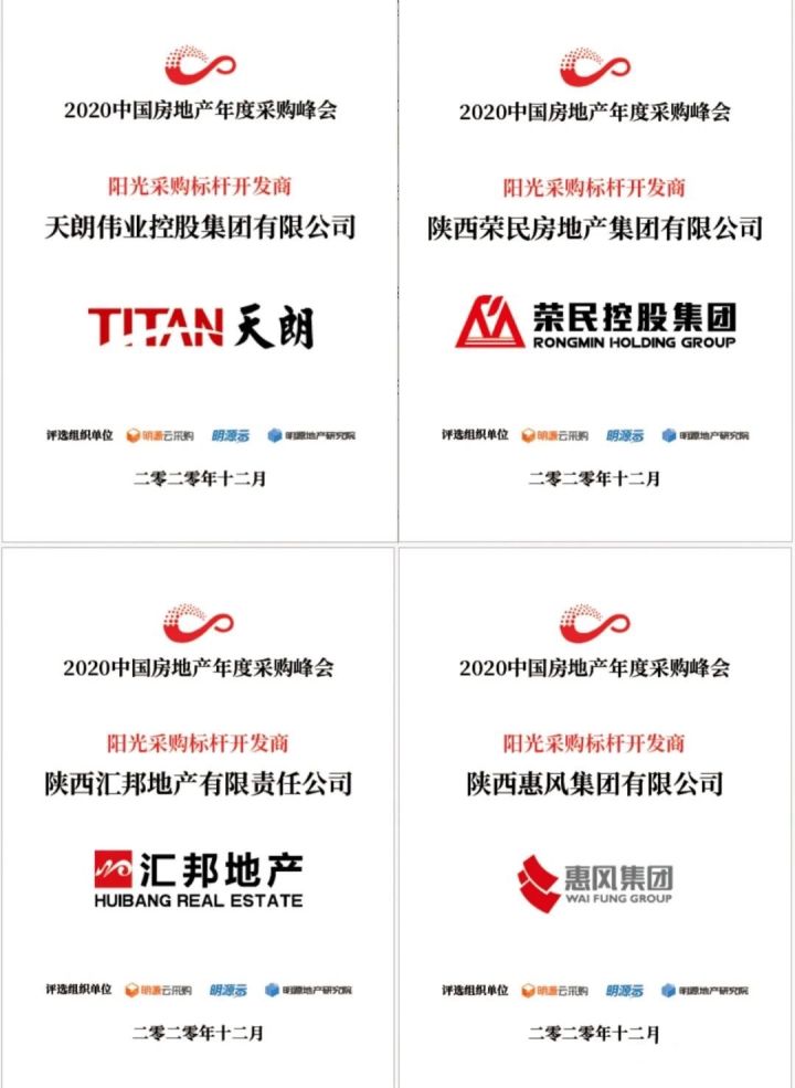 陕西区域“天朗伟业控股集团有限公司、陕西汇邦地产有限责任公司、陕西惠风集团有限公司以及陕西荣民房地产有限责任公司”在过去一年以实践举措成为具备行业示范的阳光采购新标杆,获得“2020阳光采购标杆开发商”荣誉。