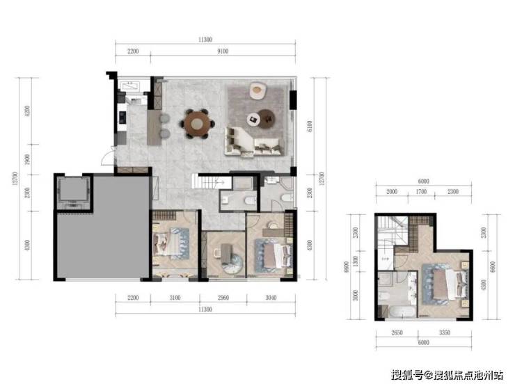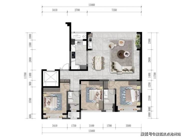 北面空中花园、客餐厅融为一体,形成近48平大横厅。同时,南面面宽约13.46米,规划三个卧室绰绰有余,最小的卧室面宽都有约3.1米的舒适尺度,主、次卧面宽则达到约3.4、3.5米。