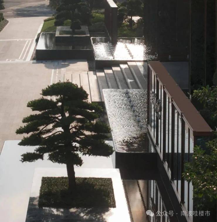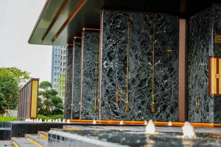 归家大门两侧以“百万级迎客松”为点缀,中间采用“泗水归堂”设计,搭配九阶石台阶、水景、多重檐口,气派奢华,岭南美学感扑面而来。