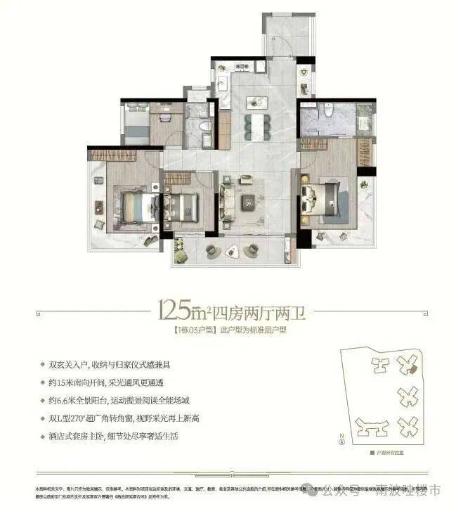 本次开放的建面约125㎡户型,做到了双玄关入户+超大景观阳台+4开间约15米面宽+奢阔4+1房。