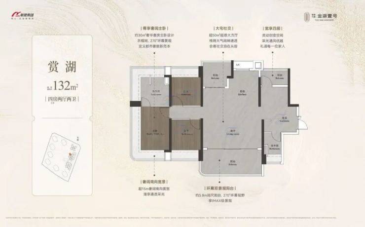 131-132㎡四房同样为全南向,部分户型能眺望湖景;