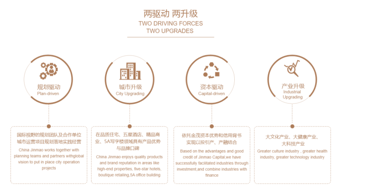 在八大业务之一的城市运营板块中,下属中国金茂控股集团坚持高端定位和精品路线,以“双轮两翼”战略基础上,聚焦“两驱动、两升级”的城市运营模式,开发+持有为双轮,服务+金融为两翼,金融创新助推地产开发,服务创新尼粘合持有运营,地产开发及持有运营协同发展。