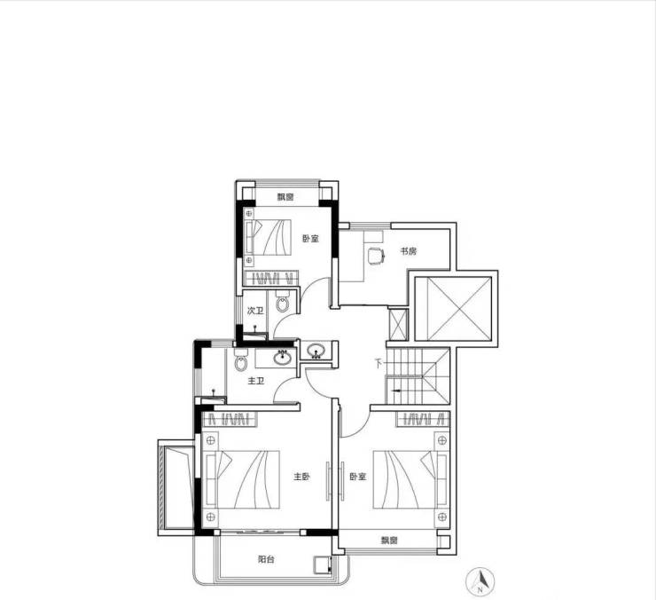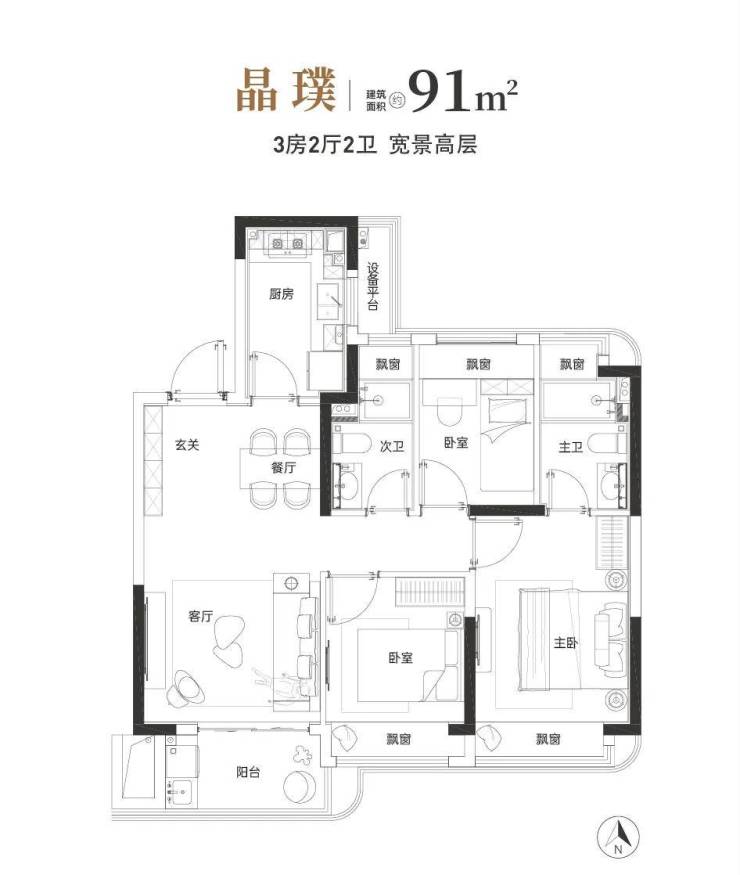 约91平3房户型,餐客厅一体,主卧套间,全屋飘窗,功能齐全。