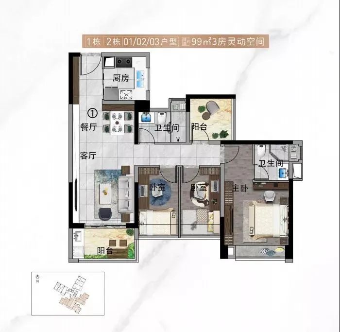 如99㎡能够做到“3+1”房户型,四开间朝南,保证通风、采光。