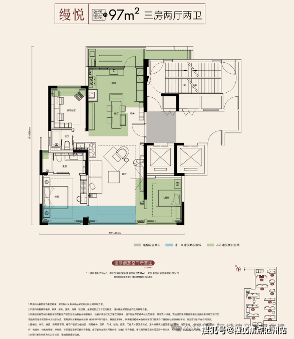 最小户型是建面约97平的三房两厅两卫:不含电梯前室,优化后得房率就有116%左右。