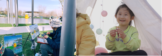 湖上游弋的网红大黄鸭,排队合影的人络绎不绝;透明的充气滚筒水车,成功俘获小朋友们的好奇心,成为高人气体验项目。芳草柔软的大片绿地上,有可供免费使用的的帐篷,最适合全家人席地而坐,和大自然来场亲密接触,数数路过的云朵,懒懒度过一下午悠闲时光,也可以像君邻会油画苑老师们一样,用画笔将眼前的美好无限放大,把无限灵动的春光跃然纸上。