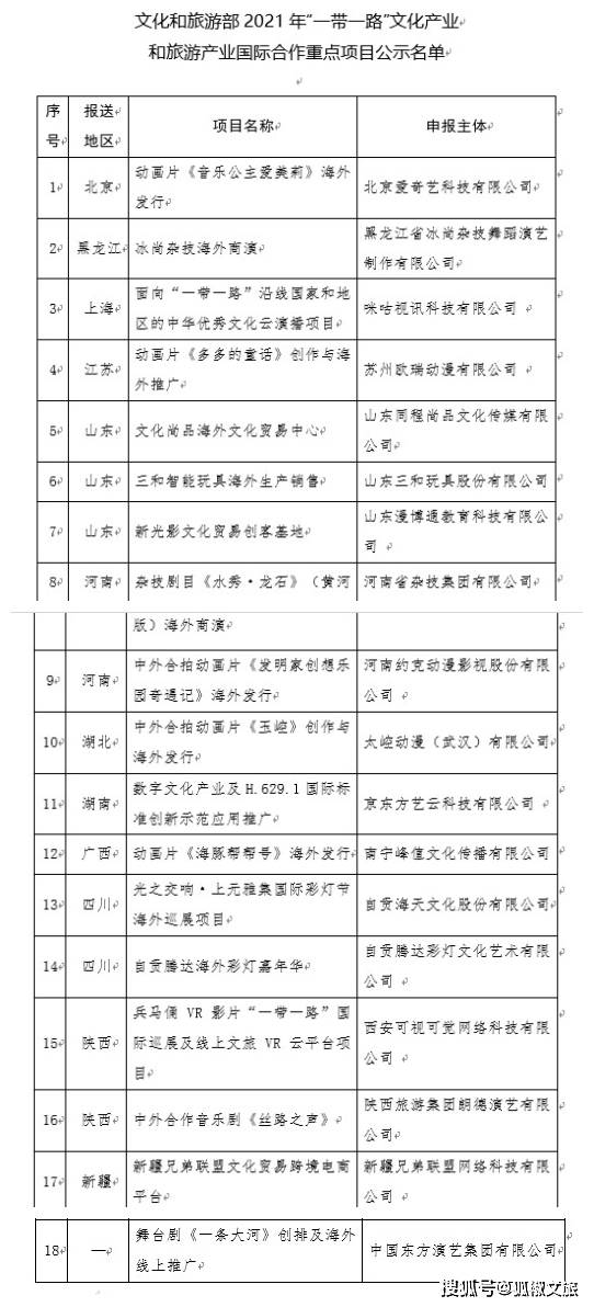 近日,文化和旅游部产业发展司针对关于2021年“一带一路”文化产业和旅游产业国际合作重点项目进行公示,公示公文如下: