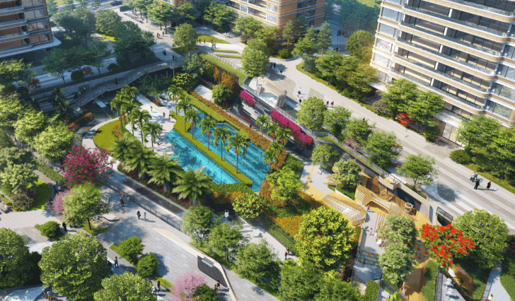 23万㎡精致园林景观,打造为市中心超大规模的城市生态绿洲,包括2公里中央景观长廊、5万㎡山顶公园、3万㎡汇景湖等。